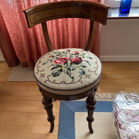 Fischel stol med træstel i blåmalet finish og ryglæn med gyldent dekormønster. Rundt sæde med broderet blomstermotiv på lys stofbetræk. Egnet som spisebordsstol, pynte- eller side-stol i boligindretning.