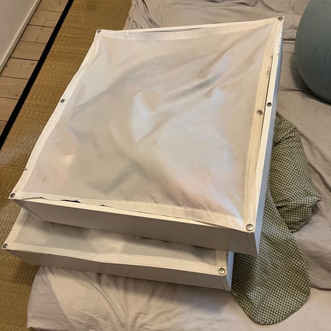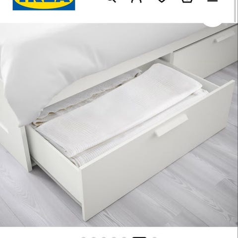 2 IKEA opbevaringsboks til seng i hvid. Boksen er beregnet til opbevaring under seng og måler ca. 90 x 53 cm. Velegnet til opbevaring af fx sengetøj, tøj eller tekstiler. Låg med lynlås hjælper med at beskytte indholdet mod støv. Passer under de fleste senge med tilstrækkelig frihøjde under sengerammen.