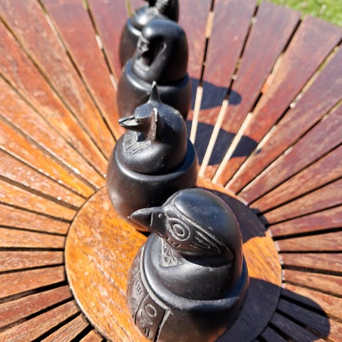 Sælger dette komplette replica-sæt af fire egyptiske kanoper (gravkrukker), der forestiller de fire sønner af Horus: mennesket (Imset), falken (Qebsenuef), sjakalen (Duamutef) og aben (Hapy).