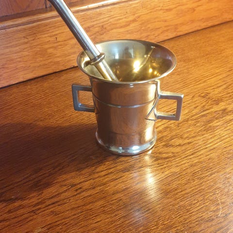 Morter, Bronze og Messing, poleret, 150 år gl., Morter og pistil. Antik. Morter af poleret bronzemalm. Pistil af poleret messing. Sælges samlet som sæt (prisen er for de to dele i alt). Har tilhørt mine oldeforældre og er formentlig fra apotek i Vinderup. Original og med brugsspor, hvilket gør den interessant, idet den ikke bare har været til pynt, men anvendt til apoteksvirksomhed. Tung og robust. Ikke-ryger hjem.