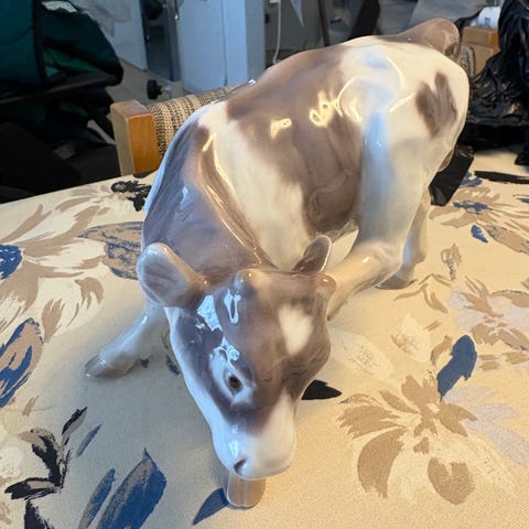 Kunstnerisk kofigur dekorationsfigur i blå og flerfarvede nuancer. Figuren forestiller en ko med malede motiver af skyer, huse og landskab på kroppen. Overfladen er glat og blank, og koen står på fire ben. På den ene baghov er årstallet 2008 malet på. Velegnet som pynt eller samlerobjekt i hjemmet, f.eks. på hylde, reol eller vindueskarm.