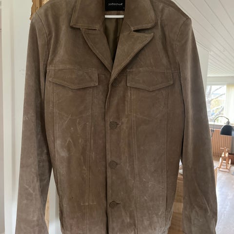 Superflot Stenberg vintage herrejakke unisex/oversize ruskind (ekte geitskinn made in Norway). Habit facon. Flot cognacfarve. 2 indvendige lommer samt 2 påsyede brystlommer og 1 indvendig brystlomme med lynlås. Flot påsyet skindkant på ærme. Virkelig en højkvalitets jakke. Endda original ekstra knap. Ingen huller. Har en lille afskalning af skindet nederst på jakken (ser lysere ud på billedet end i virkeligheden😉). Vil tro det er hvad der svarer til en str 48. Mål: Bryst: 112cm (omkreds under arm), Livvidde: 108cm (omkreds), Armlængde 43cm (under arm), Skulderbredde: 47cm, Længde: 72cm.