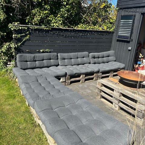 Grå pallehynde med tilhørende ryghynde til udendørs palle-sofa. Sættet består af en tyk sædehynde og en høj ryghynde med knapper. Hynderne er velegnede til brug på paller i haven eller på terrassen og giver en polstret sidde- og rygflade. Farven er neutral grå, som passer til de fleste udendørs miljøer. Materiale ser ud til at være tekstil med skumfyld. Hynderne er beregnet til udendørs brug, men bør opbevares tørt uden for sæson eller ved kraftig regn for længere holdbarhed.