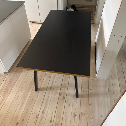Skrivebord fra Ikea. Lysegrøn bordplade med sorte ben. Brugt sparsomt. Står rigtig pænt.