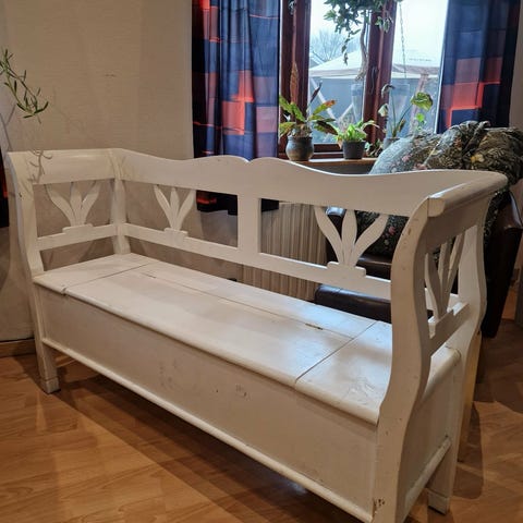 Antik slagbænk malet i svensk stil med opbevaringsplads. Prisen er pr. stk.