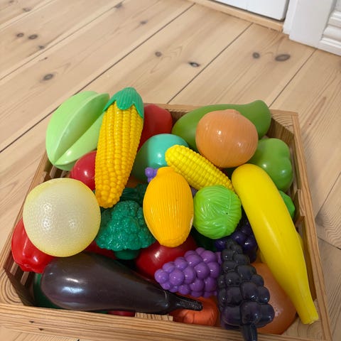 Legetøjsmad sæt bestående af en plastikkurv fyldt med forskellige stykker legetøjsmad. I kurven er der blandede plastikfrugter og grøntsager i flere farver. Sættet kan bruges til rolleleg i legekøkken, butik eller café og giver mulighed for at sortere, tælle og navngive de forskellige madvarer.