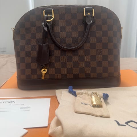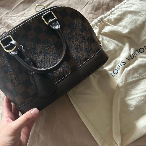 Sælger min mors Louis Vuitton Alma PM i det klassiske Damier Ebene mønster. Tasken er købt i en Louis Vuitton-butik og er i rigtig flot stand. Tasken har to tophåndtag og lynlåslukning. Indvendigt er der et rummeligt hovedrum.