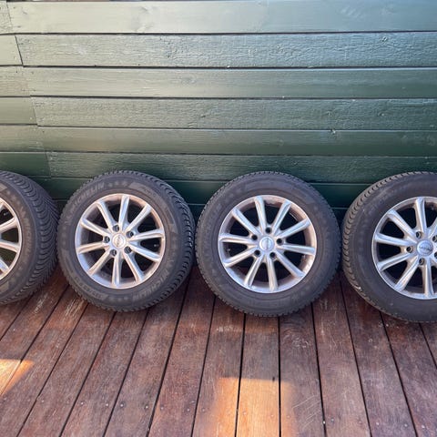Fælgene er i pæn brugt stand med almindelige små brugsspor (se billeder). Dækkene har stadig mønster tilbage, men præcis restmønster kendes ikke – se billeder eller spørg for info.