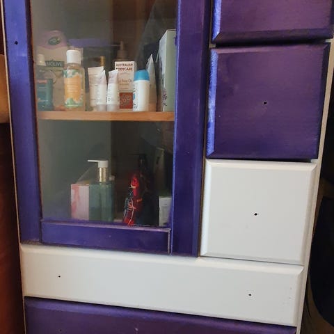 Udført i massivt fyrretræ og efterfølgende malet/glaseret i en flot lys grå nuance med naturlig patina. Skabet er monteret med dekorative lyseblå porcelænsknopper.