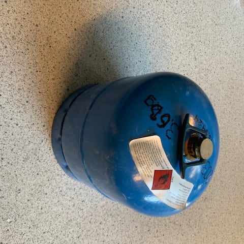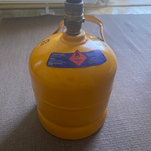 Lille tom 2 kg gasflaske (tare 3,56 kg) sælges, -perfekt til balkon, båd eller lign hvor der ikke er så meget plads