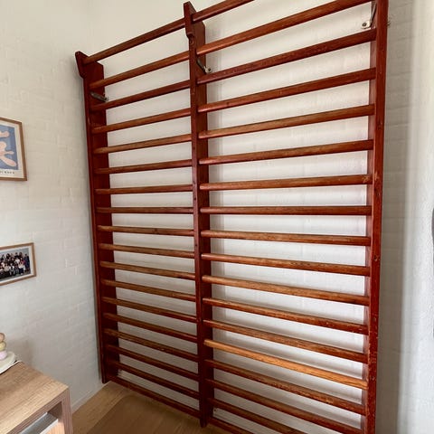 Gammel skole ribbe står og samler støv i en kælder, i fin stand.