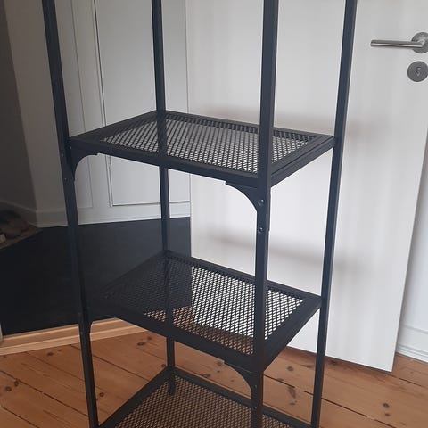 2 galvaniseret metal reoler. stykke pris kr. 750. Både reoler sælges til kr. 1300 2 metal hylder (38X38 cm) , 1 glas hylde 38X38 cm, 1 glas hylde 35 cm, 3 glas hylder 38X 8cm .