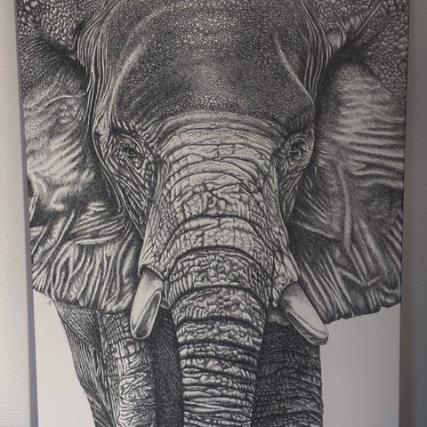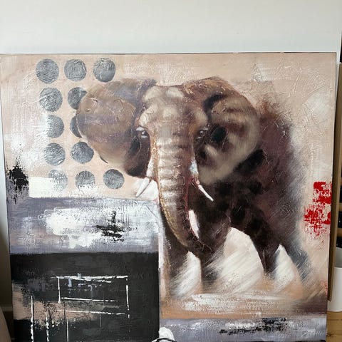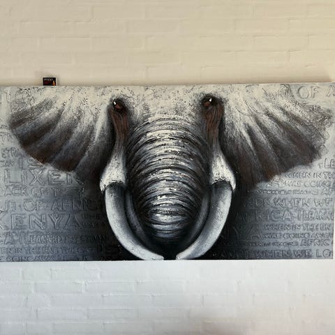 Lærredsmaleri med elefantmotiv i neutrale farver. Billedet viser en elefanthoved-illustration i sort, hvid og grå med rødlige og brune detaljer i baggrunden. Maleriet er udført på opspændt lærred med træramme på bagsiden og ophængssnor monteret, klar til ophængning på væg.