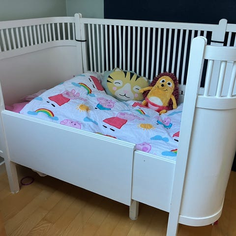 Tremmeseng med aftagelige sider. Sengen kan udvides til en junior.