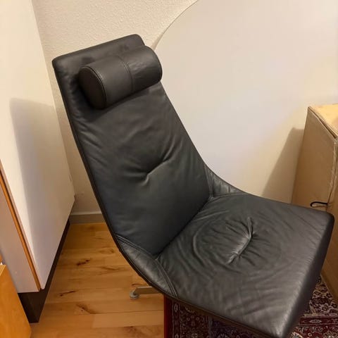 I sort læder, den ene strop i hynden er gået af men mangler ikke. Stropper i nakkepude er slidt ved påsyning men ellers ingen fejl. Ikke brugt meget mere stået til pynt. Rygefrit hjem
