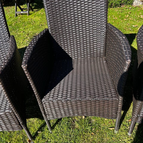 Havestol og bord i flet i mørkegrå farve. Inkl loungestol med armlæn og en lav firkantet bord-/fodskammel-del i samme materiale og farve. Møblerne er udført i kunstflet på metalstel og er velegnede til udendørs brug.