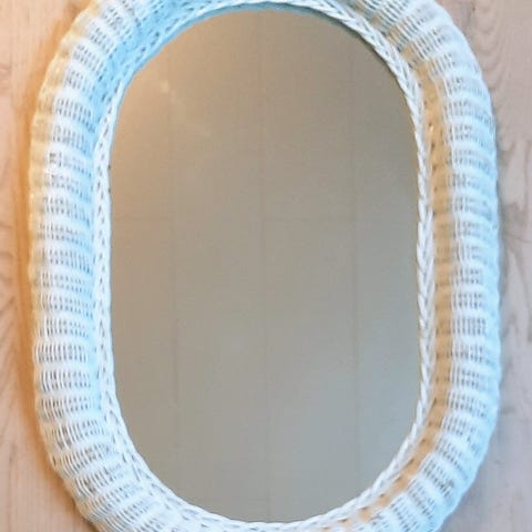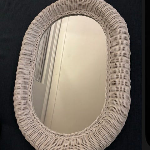 IKEA spejl med flet ramme i hvid. Rektangulært spejl med buet top og ramme i flettet materiale. Velegnet til ophæng på væg i fx entré, soveværelse eller stue. Bagsiden har ophængsbeslag til montering på væg.