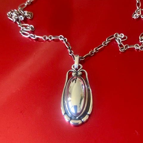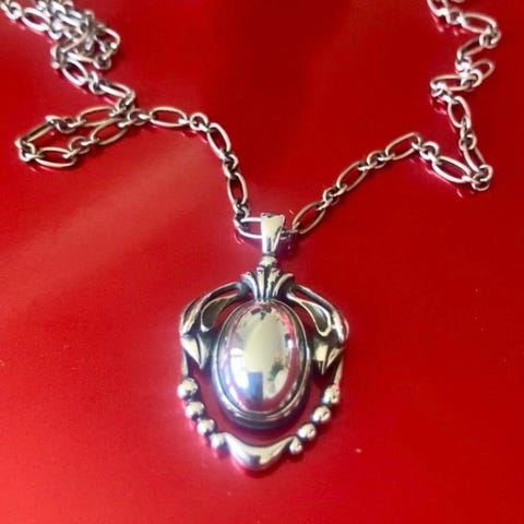 Georg Jensen halskæde i sterlingsølv. Vedhænget har et ornamenteret, bladlignende motiv med små kugledetaljer forneden. Kæden er i sølv med enkle led. Smykket er egnet til daglig brug eller som et mere klassisk smykke til særlige lejligheder. Kan hentes i Køge (Ølby) eller i Brøndbyøster. Fast pris.