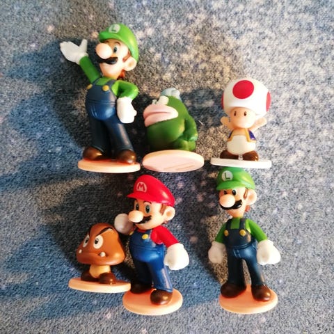 Nintendo Super Mario figurer i plast med flere forskellige figurer og elementer fra Super Mario-universet. Sættet omfatter blandt andet flere udgaver af Mario og Luigi, Yoshi, Princess Peach, Koopa Troopa, Shy Guy, Lakitu på sky med flag, guldmønt- og stjerneelementer samt forskellige blokke og fjender.