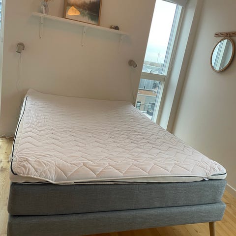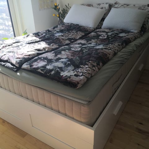 Sengen kostede 5.000 kr. fra ny og er sidenhen blevet opgraderet men en WELLPUR Memoryskum topmadras der er allergivenlig og vaskbar - denne er købt i Jysk for 1. år siden (https://jysk.dk/sovevaerelse/madrasser/topmadrasser/topmadras-140x200cm-wellpur-bokselvi-graa).