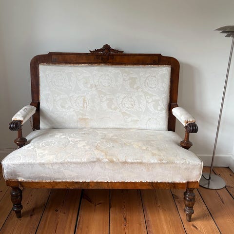 Fin og meget gammel slagbænk i massiv fyr med masser af patina. Ryg og armlæn med schwung og fine udskæringer, charmerende ben. 3 ben har behov for restaurering, se billeder. Mål i cm: L: 186 - D: 55 - H: 46 - længde inkl. armlæn: ca. 203. Sendes ikke.