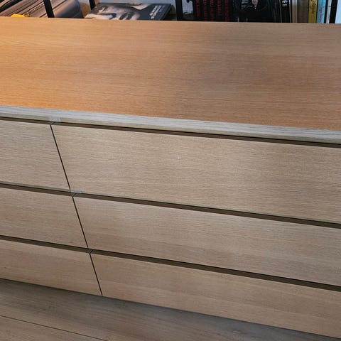 Kommode i lys egetræslook med fire rummelige skuffer, glat overflade og minimalistisk design, perfekt til opbevaring i stuen eller entréen.- Bemærk at mail, chat og beskeder ikke besvares, og varen skal købes på knappen "Gå til varen". Efter reservering af varen har du 10 dage til at afhente den i den butik, varen er på lager i.