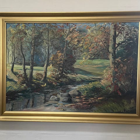 Olie maleri med naturskildring, der illustrerer en bro over en å omgivet af frodige træer og farverige blade, indrammet i en klassisk gylden ramme.- Bemærk at mail, chat og beskeder ikke besvares, og varen skal købes på knappen "Gå til varen". Efter reservering af varen har du 10 dage til at afhente den i den butik, varen er på lager i.