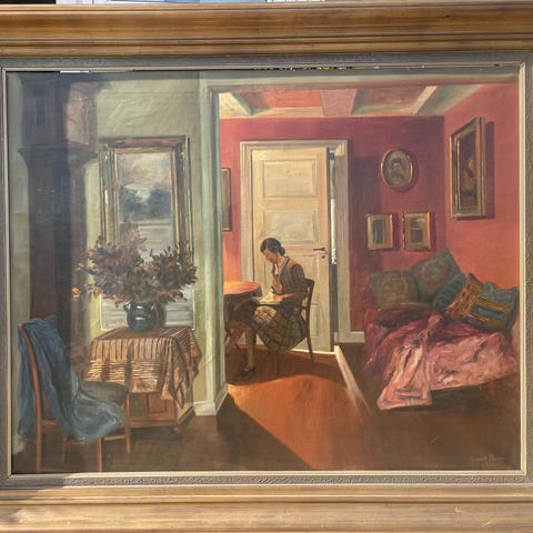 Farverig maleri med en stille interiørscene, der fanger naturligt lys og dyb skyggeeffekt. Indrammet i klassisk guldramme.- Bemærk at mail, chat og beskeder ikke besvares, og varen skal købes på knappen "Gå til varen". Efter reservering af varen har du 10 dage til at afhente den i den butik, varen er på lager i.