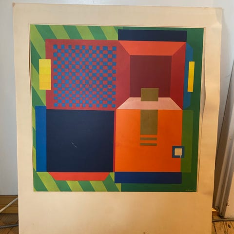 Grafisk litografi af Karl Aage Riget i ramme med abstrakt motiv i klare farver. Motivet består af geometriske former i blandt andet rød, blå, gul, grøn og lilla samt ternet mønster og cirkelfigurer. Plakaten er indrammet i en enkel trækantet ramme med glas. Velegnet som vægdekoration i stue, kontor eller andre opholdsrum.