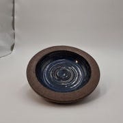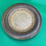 Fad i brunlig glas med blank overflade og unik, struktureret glasur, perfekt til servering af salater eller snacks.