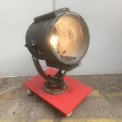 Gl. fransk Cremer Paris teaterprojektør på indstilleligt 3-ben. Lyset virker og har været brugt som lampe i stuen.