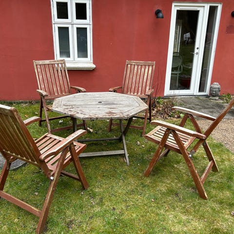 Havemøbelsæt, hvidt hårdttræ, høj kvalitet, opbevaret inde om vinteren, FSC mærket, bord 150x86 cm.
