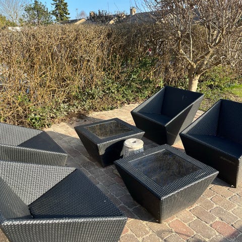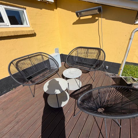 Havemøbelsæt bestående af to loungestole og en bænk i sort metal med snoredesign. Møblerne har slanke ben og er velegnede til udendørs brug på terrasse, altan eller i have. Sættet giver en åben og let siddeoplevelse og kan bruges som afslapningsområde udendørs.