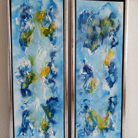 Abstrakt maleri på lærred i blå, hvide og grøn/gule nuancer. Maleriet haret format på 65b og 85h med kraftige strukturer og lag af maling, der skaber et reliefagtigt udtryk. Farverne spænder fra lyse til mørke blå toner kombineret med hvid og enkelte gule/grønne detaljer. Leveres indrammet i en enkel ramme, som ses på billederne.