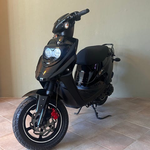 Explora Uros scooter i sort. Scooteren har Euro 6-motor ifølge mærkat på motorafdækningen. Karrosseriet er i sort plast med synlige brugsspor og ridser på siderne. Forenden har integreret forlygte og blinklys, og bagtil ses affjedring og hjul med vejbanedæk. Velegnet som mindre by- eller pendlerkøretøj afhængigt af teknisk stand og registreringsforhold.