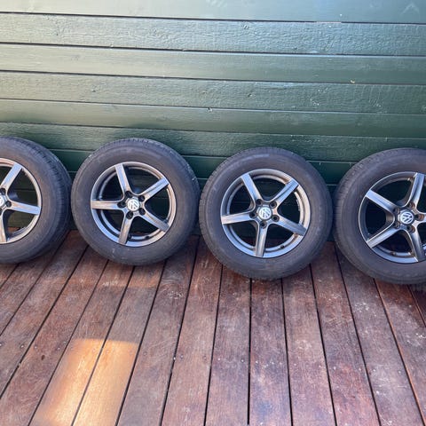 Original VW fælge fra en Golf 7 (passer mange andre VW biler) uden kant kys med Michelin sommerdæk. Dækkerne er fra 1 x 2022, 2 x 2018 og 1 x 2014.