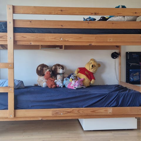 Køjeseng fra trævarefabrikkens udsalg (Woody Emma). Køjesengen er ikke fra Hoppekids men DBAs AI lader mig ikke ændre mærke til andet.