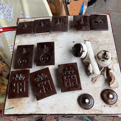 Samling af gamle elektriske komponenter i bakelit, herunder runde og firkantede afbrydere samt stikkontakter i brun og sort. Delene fremstår brugte og med synlige brugsspor. Egnet til reservedele, dekoration eller projekter, hvor originale ældre el-dele ønskes. Antal og præcise mål fremgår af billederne. Sælges samlet som viste dele.