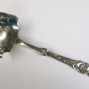 Strøske, sølv, 148 år gl., Sukkerstrøske. Ske til at strø sukker med. Tretårnet sølv 1877. Div. stempler. Forgyldt laf. Vægt 36,7 gram. Længde 19 cm. Meget smuk og i fin stand. Kan sendes til pakkeshop for kr. 50