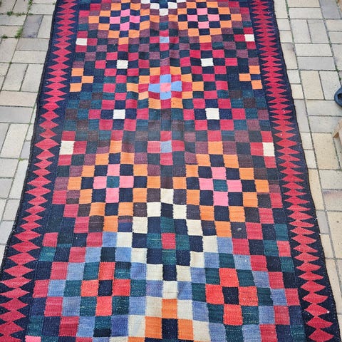 tæppe i patchwork-stil. Tæppet måler 308 x 203 cm ifølge mærkatet. Det er flerfarvet med geometriske og etniske mønstre i blandt andet rød, blå og beige nuancer. Bagsiden har stribemønster. Luv i 100 % uld og bund i bomuld ifølge mærkatet. Velegnet som gulvtæppe i stue eller andre opholdsrum.