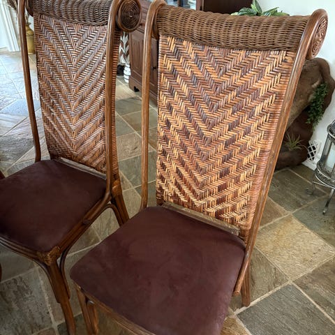 Stole i flettet rattan I mørkbejset look med mørke ben og top af ryggen. Velholdte, og med hynder hvor alle bindebånd er intakte.