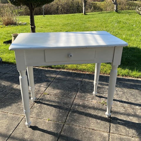 Lille bord i mørkt træ med drejede ben og udskårne detaljer. Rektangulær bordplade i massivt træ med synlig årestruktur. Understel i træ med fire slanke ben, der er profilerede og afsluttet med dekorative elementer. Velegnet som sidebord, konsolbord eller lille skrivebord i stue, entré eller soveværelse.Tror det er egetræ. Mål:Højde=75cm/Bredde=77cm/Dybde=48cm. Afhentes på Amager.