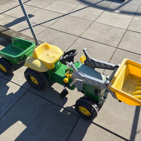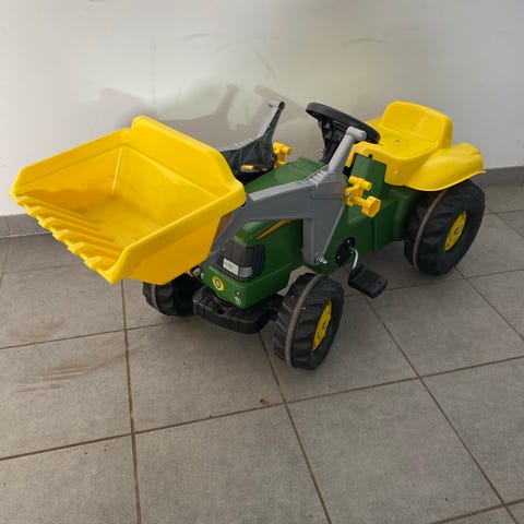 gul plast. Traktoren har fire plastikhjul med sorte dæk og gule fælge samt ratstyring. Foran er der en funktionel frontlæsser, og bagpå et gult lad til transport af legetøj eller sand. Modellen er beregnet som udendørs køretøj til børn, der kan træde pedalerne rundt og styre traktoren selv. Plastmaterialet gør den velegnet til brug i have, indkørsel eller på legeplads. Eventuelle brugsspor og revner fremgår af billederne.