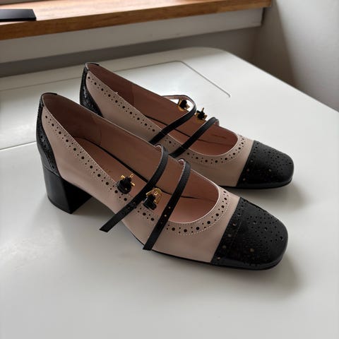 Skoene er i beige med sort, quiltet tå og har en mellemhøj hæl . Overdel og sål fremstår som læder. Klassisk pump-model egnet til fest og pænt brug. Farvekombinationen gør dem anvendelige til både lyse og mørke outfits. På billederne ses lette brugsspor og nogle mærker i læderet på overdelen. Velegnet til dig, der søger en enkel og klassisk festsko i neutral farve med sort kontrasttå.