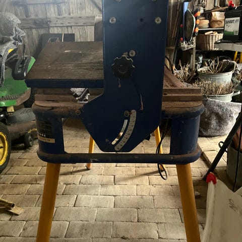 Maskinen står på fire ben og har et arbejdsbord til understøttelse af fliser og sten.