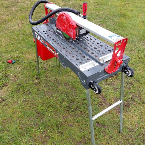 Einhell fliseskærer på stativ. El‑drevet vådskærer med vandkøling og integreret vandtank/slanger.