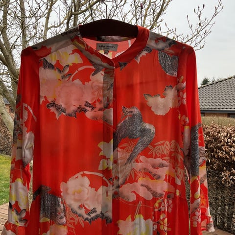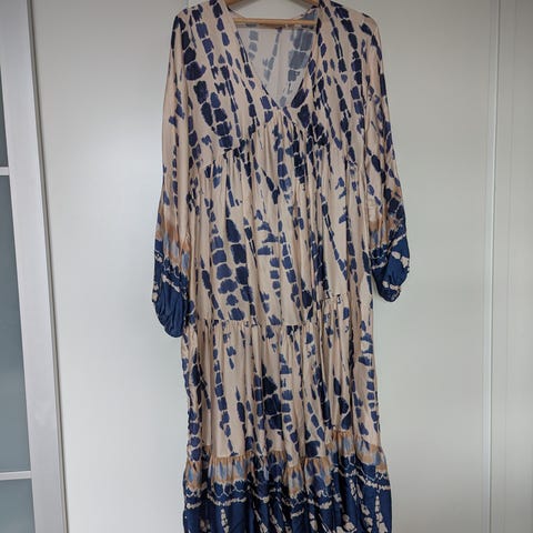 Lollys Laundry sommerkjole i str. XL. Kjolen er beige med mørkeblåt bladprint. Materialet er viskose med en let, faldende kvalitet. Modellen har slå-om-effekt foroven og er ærmeløs med små flæsedetaljer ved skuldrene. Velegnet som sommerkjole til hverdag eller ferie.