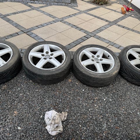 Der er to med meget slidbane, to med lidt slidbane, der medfølger bolte og låsebolte med. Samt to helt nye dæk med
