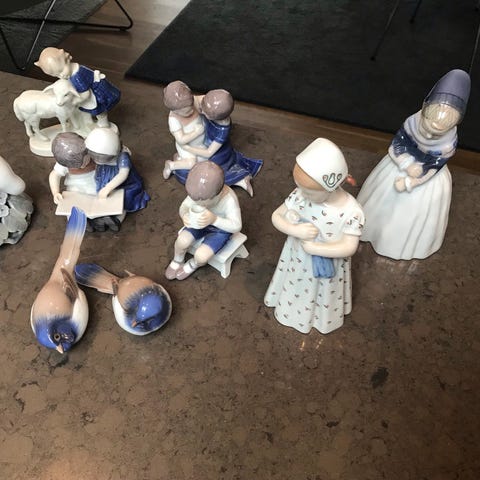 Porcelænsfigur med to børn, der sidder tæt sammen og læser i en bog. Den ene figur bærer kjole i blå nuancer, mens den anden har lysere tøj. Figuren er udført i glaseret porcelæn med bløde, afrundede former og neutrale farver. Velegnet som dekoration på hylde, vindueskarm eller i vitrineskab.
