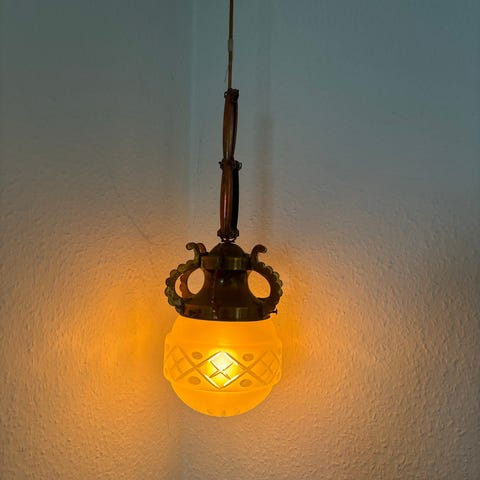 Velegnet som spisebords lampe, over en kommode eller i mindre entre. Lampen er testet og virker efter hensigten. Måler 17cm i diameter og 13cm i højden. målt inkl. messing toppen. Ledningen er 220cm lang.